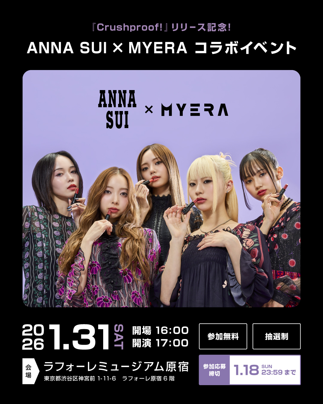 ANNA SUI LIPSTICK × MYERA フィーチャリング記念【『Crushproof!』リリース記念 ANNA SUI × MYERA コラボイベント】開催決定・抽選受付開始!
